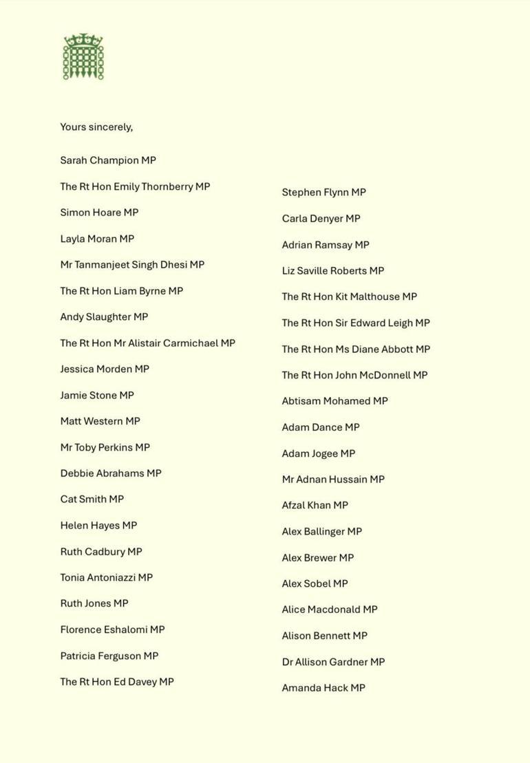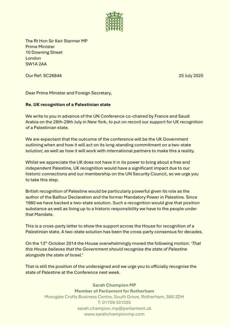 Mektup, önümüzdeki hafta New York’ta düzenlenecek Uluslararası Filistin Konferansı’nda İngiltere’nin Filistin’i resmen tanıması talebiyle son buldu.